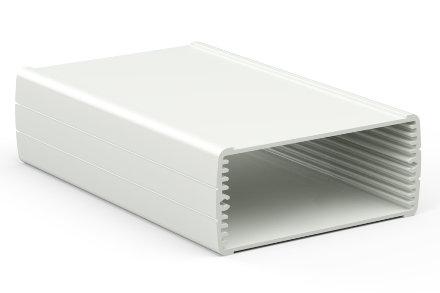 Extruded aluminium cases with high quality painted finishing. Two ABS front panels, internal slots for PCB’s and a recessed area for a keypad membrane. Six standard models are available with different sizes. The models with “-E” have mounting wall panels. Closing by eight screws