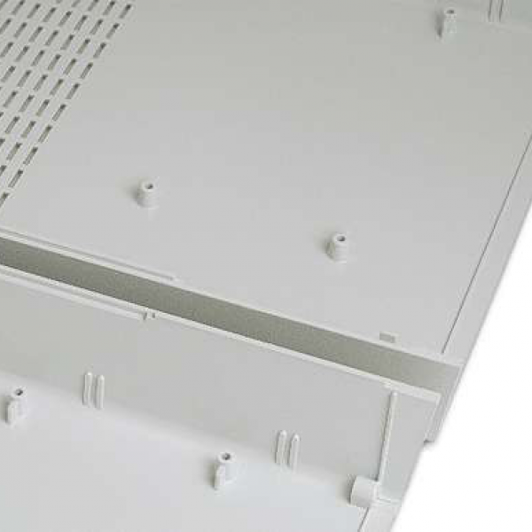 ABS enclosures with a vented cover and base for aeration. Front and rear 1 mm aluminium panels. Each half-shell has integral PCB guides and mounting studs. Matt surface finish. Closing by eight screws.