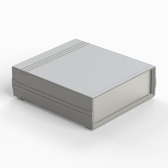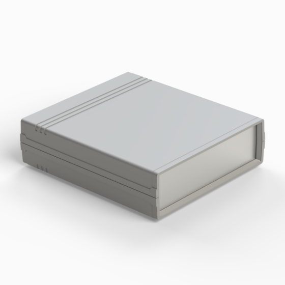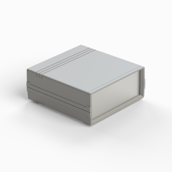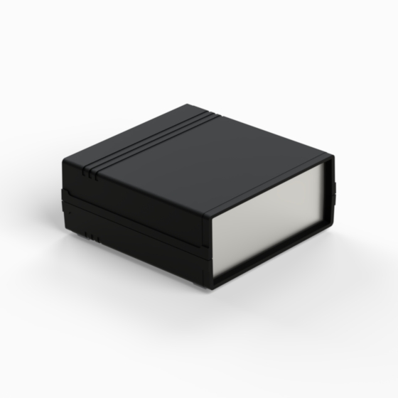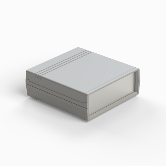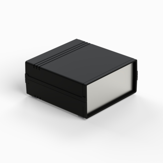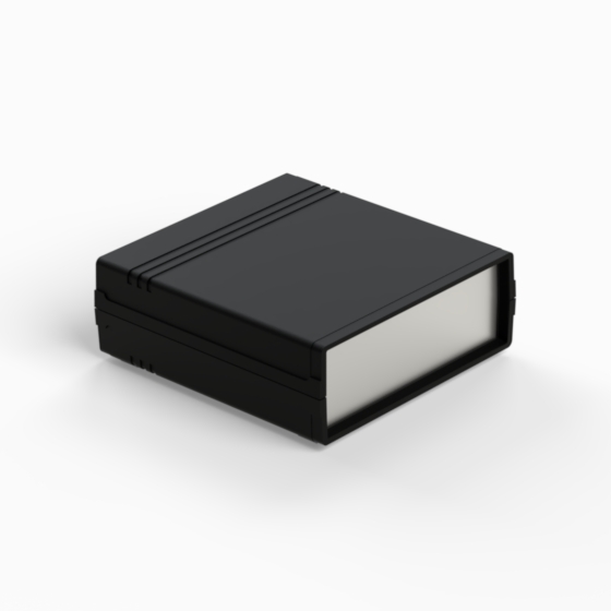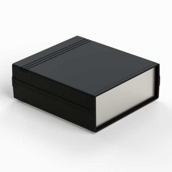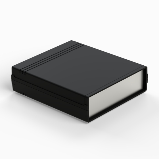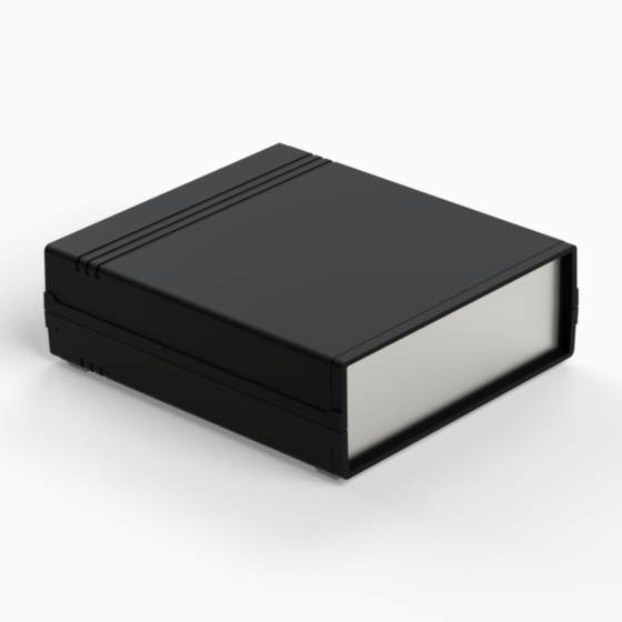 An ABS enclosure with two 1 mm aluminium panels. Each half-shell has integral PCB guides and mounting studs. Matt surface finish. Closing by only two screws. Available also front and rear panels manufactured from ABS (.13).