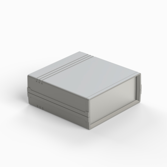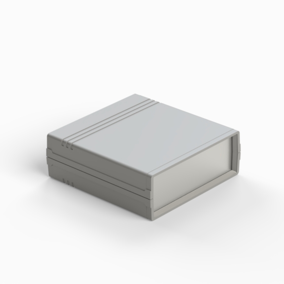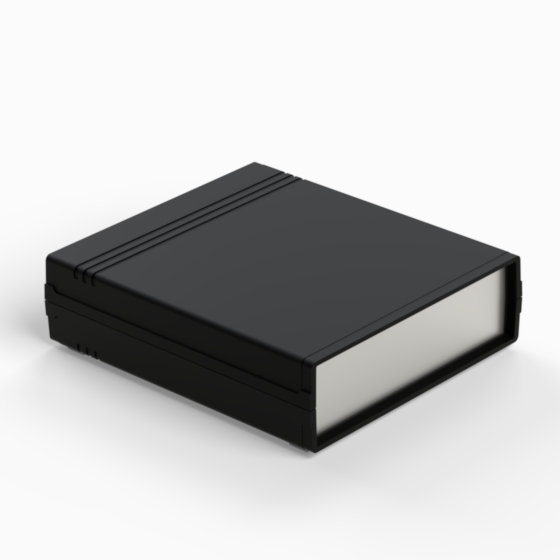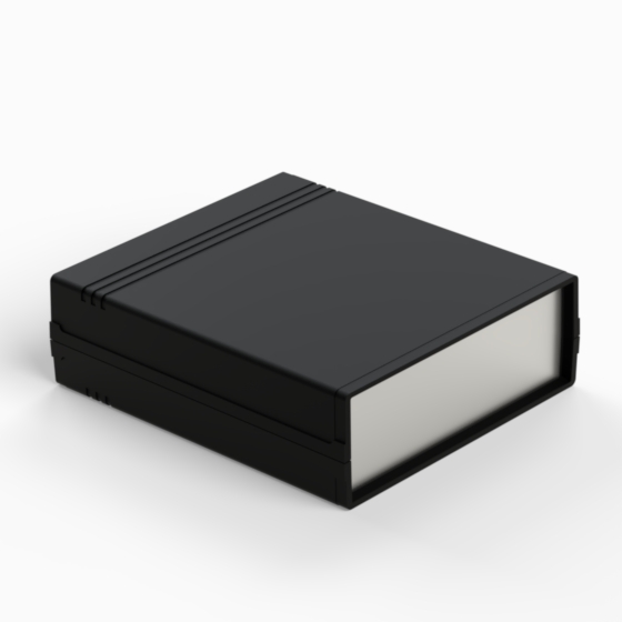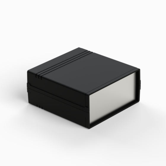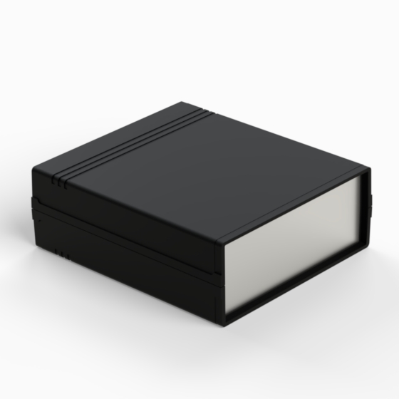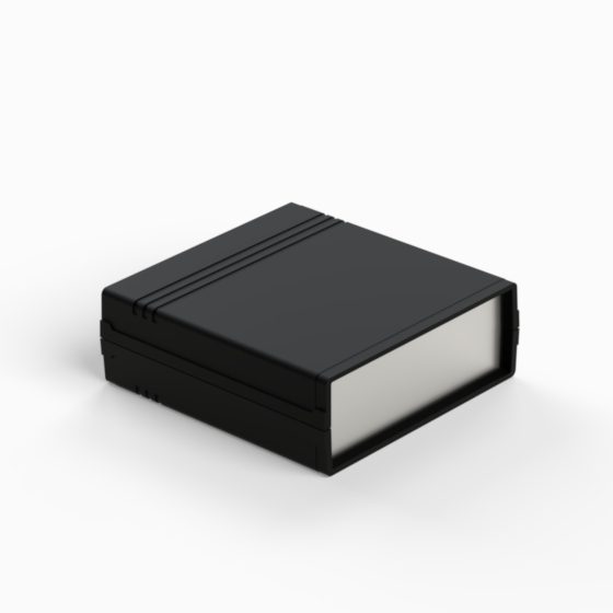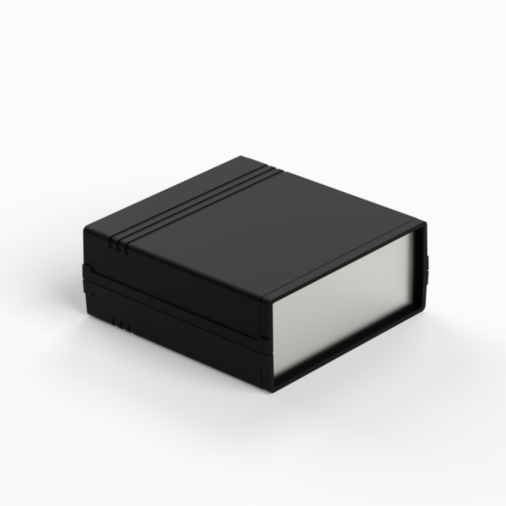 An ABS enclosure with a 9V battery compartment in the rear panel. Each half-shell has integral PCB guides and mounting studs. Matt surface finish. Closing by only two screws. Available also ABS front panels (.13).