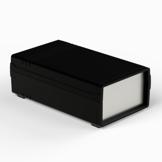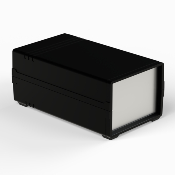 An ABS enclosure with two 1 mm aluminium panels. A 9V battery compartment with a Snap-On lid. Each half-shells has mounting studs. Mat surface finish. Closing by only two screws. Available with plastic panels (Mod. PPD1. PPD2, PPD3).