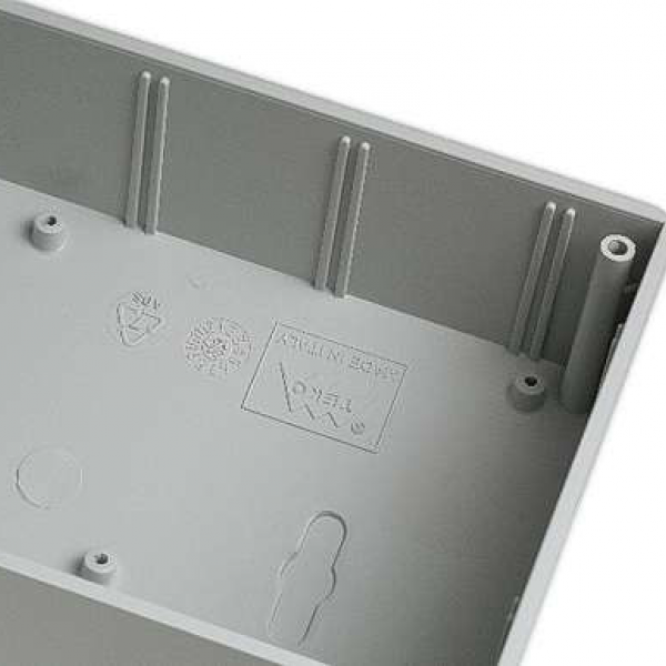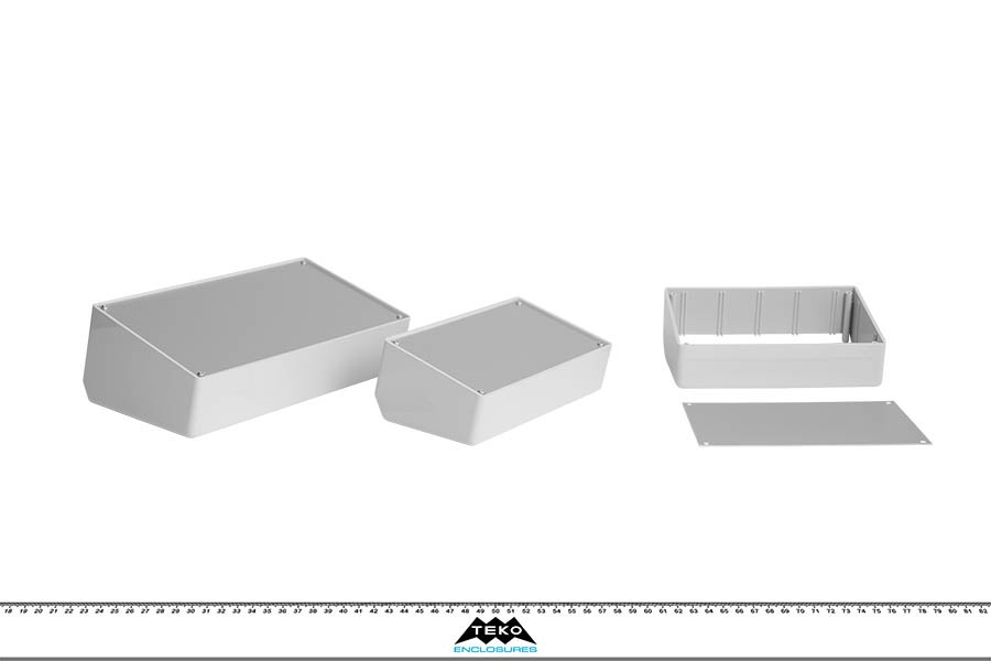 ABS enclosure with a 15° inclined 1mm aluminium panel. The base walls have integral PCB guides and mounting studs. Rounded corners. Glossy surfaces finish. Closing by four screws.