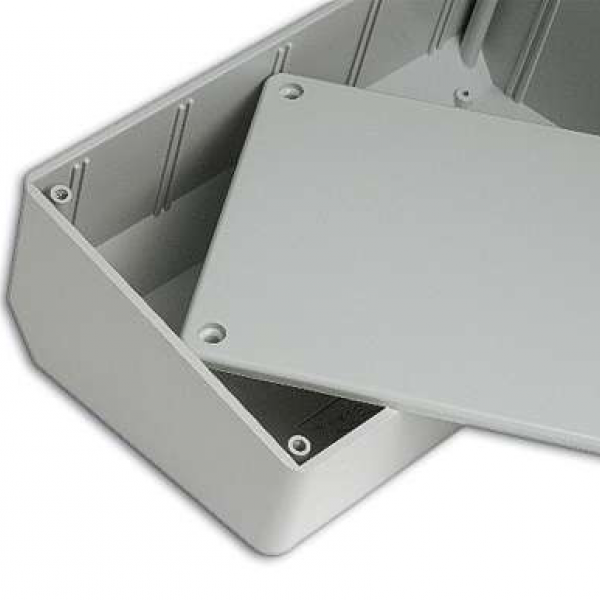 ABS enclosure with a 15° inclined panel. The base walls have integral PCB guides and mounting studs. Rounded corners. Glossy surfaces finish. Closing by four screws.
