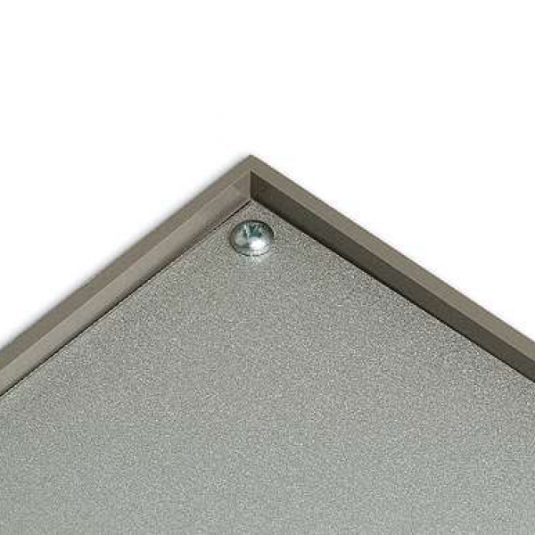 ABS enclosure with a 15° inclined 1mm aluminium panel. The base walls have integral PCB guides and mounting studs. Glossy surface finish. Closing by four screws.