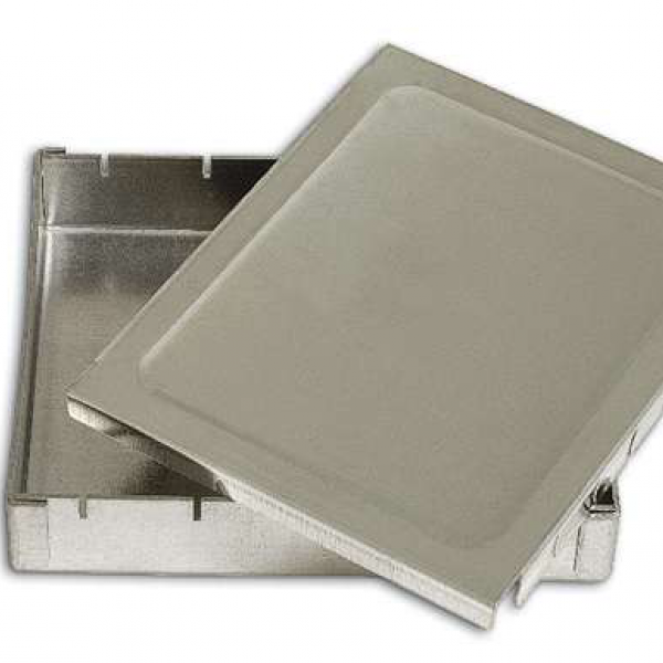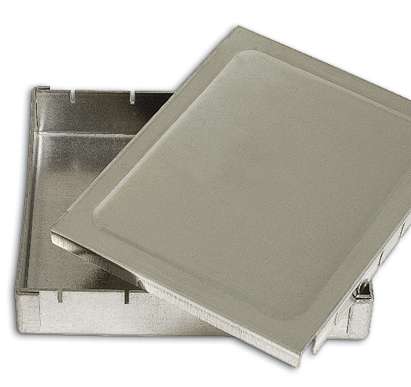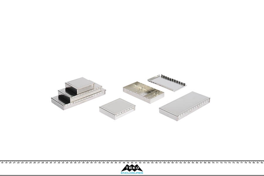 A hot tin-plated steel enclosure with Snap-On, finger-flanged cover and vertical dividers. The dividers have a hole and cutout for wiring. Volume of casing is suitable for easy assembly of professional and High-Technology circuits.