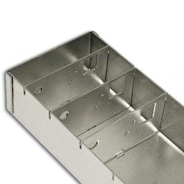 A hot tin-plated steel enclosure with Snap-On, finger-flanged cover and vertical dividers. The dividers have a hole and cutout for wiring. Volume of casing is suitable for easy assembly of professional and High-Technology circuits.