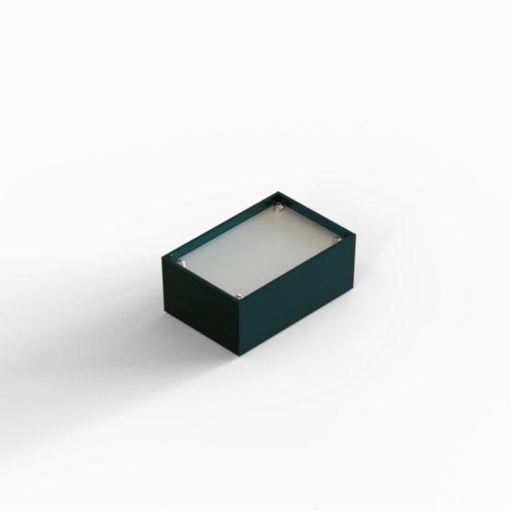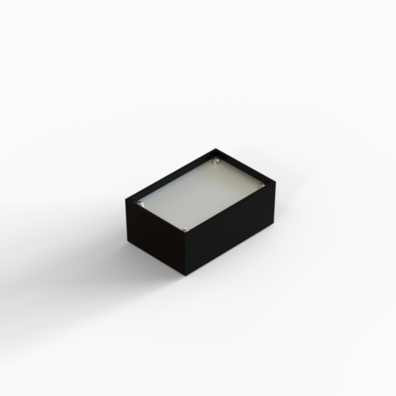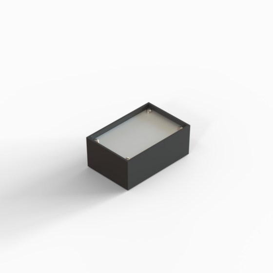 ABS enclosures with square corners and glossy surface finish. The base walls have integral PCB guides. P series have 1 mm aluminium panel.