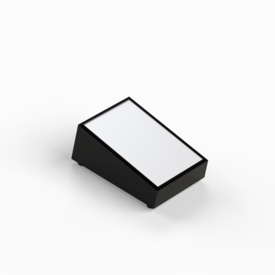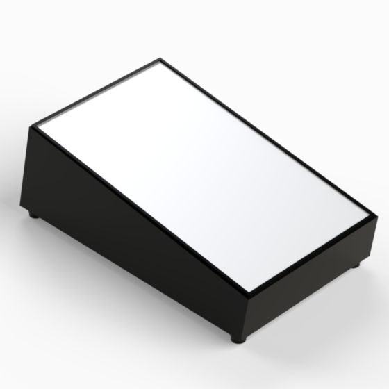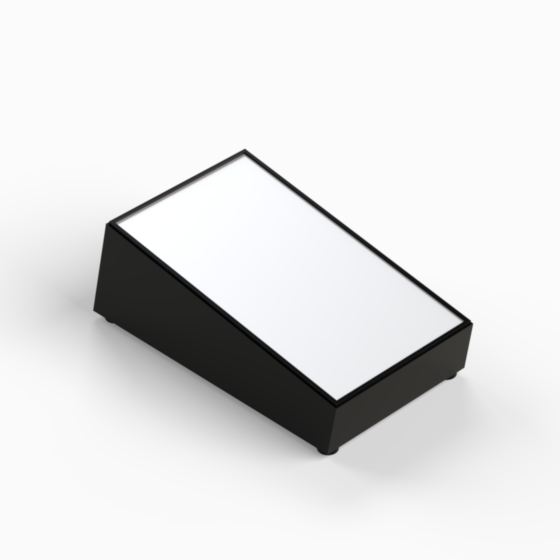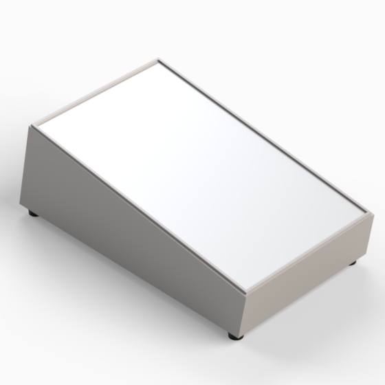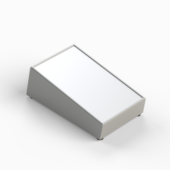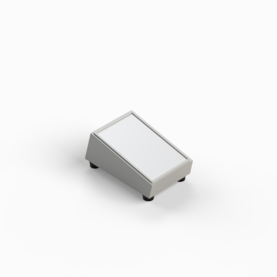 Coffrets en ABS, incliné à 10° ou à 12° pour la commande et la lecture des instruments. Angles carrés et quatre pieds antidérapantes (Mod. PT/4). Guides internes pour fixer le circuit imprimé. Deux panneaux en aluminium. Montage par quatre vis.