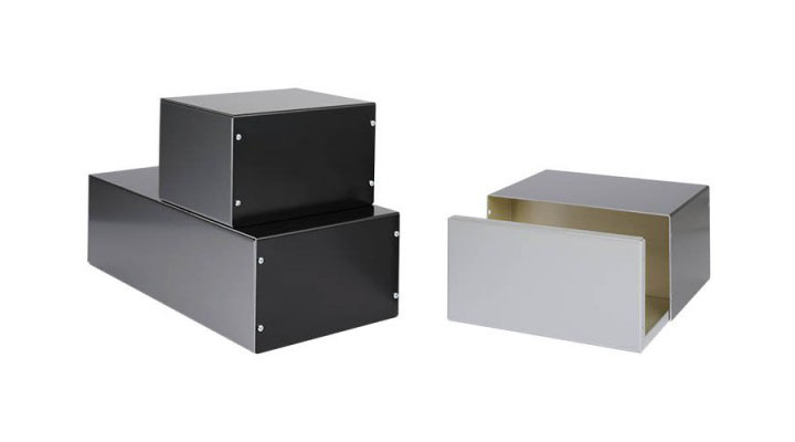 Contenitori in alluminio composti da fondo metallizzato di colore argento e coperchio metallizzato di colore nero. Assemblaggio facile e veloce con chiusura quattro viti. Il modello 424.18 è disponibile su richiesta.