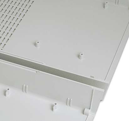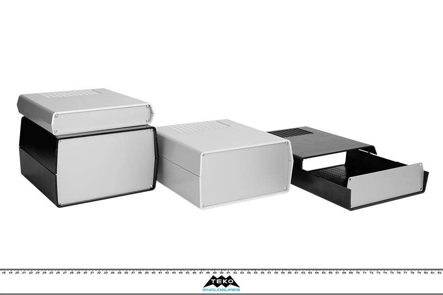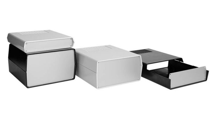 Contenitori in ABS con superfici opache e dotati di due pannelli frontali in alluminio di spessore 1 mm. I gusci superiori ed inferiori sono dotati di una foratura per aerazione e sono dotati di punti di fissaggio per PCB. Chiusura a otto viti.
