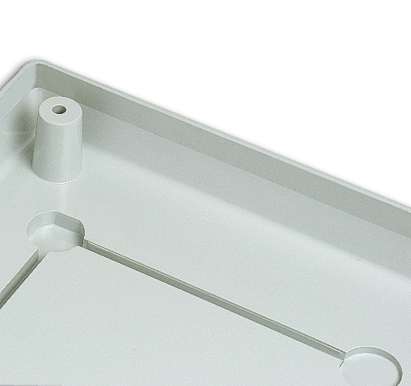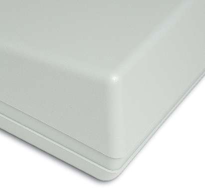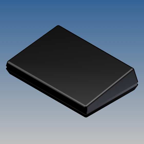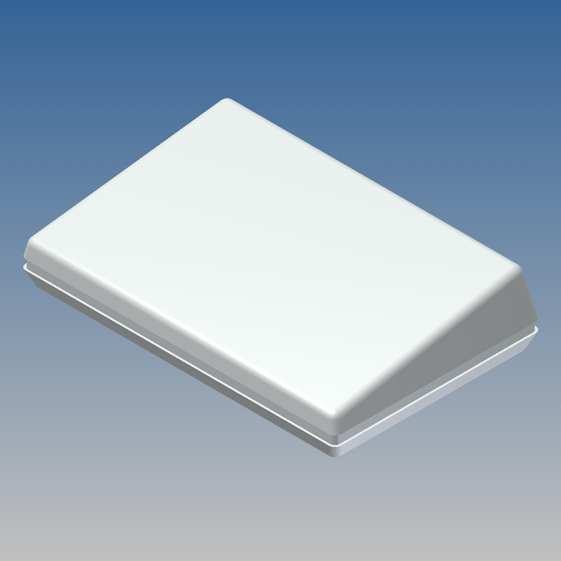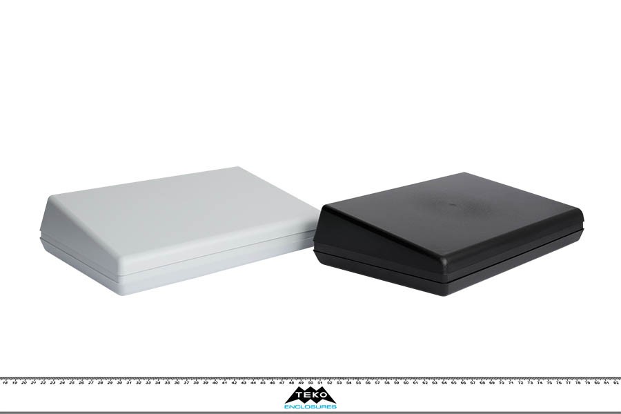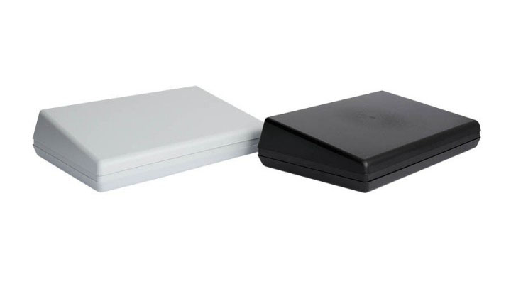 Contenitore in ABS con superfici opache e coperchio inclinato. All’interno sono presenti punti di fissaggio per PCB. Chiusura a quattro viti.