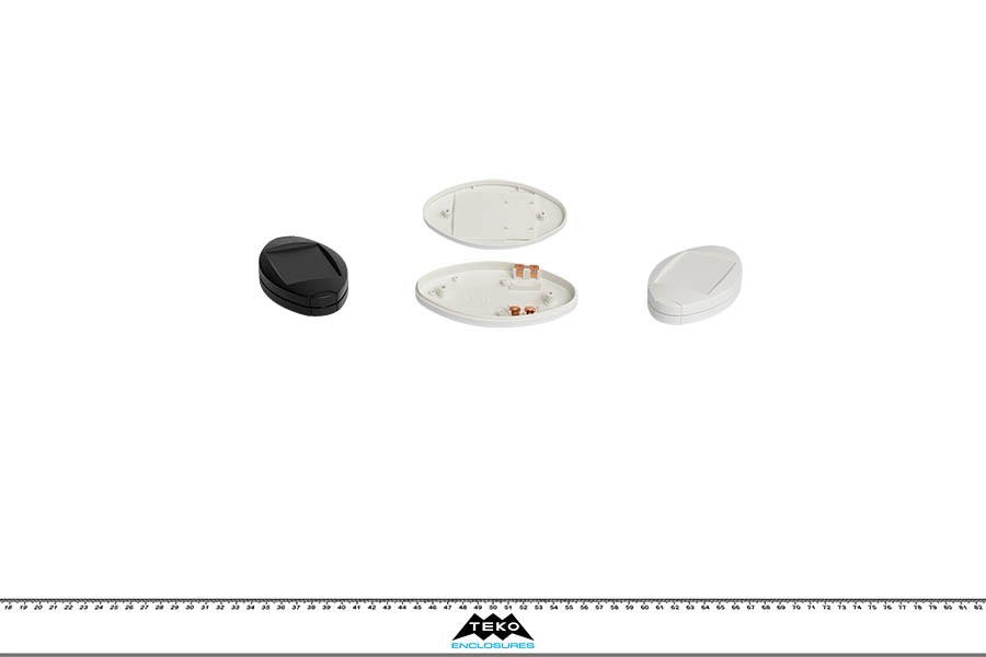 Contenitori ergonomici in ABS con superfici opache. La parte superiore presenta un’area ribassata di 67,5 X 43 mm per l’alloggiamento di tastiera a membrana. All’interno sono presenti dei supporti per due batterie da 1.5 V (AAA). Il modello “OVO-1IR” ha un foro frontale per Led. Chiusura con due viti.