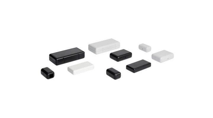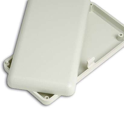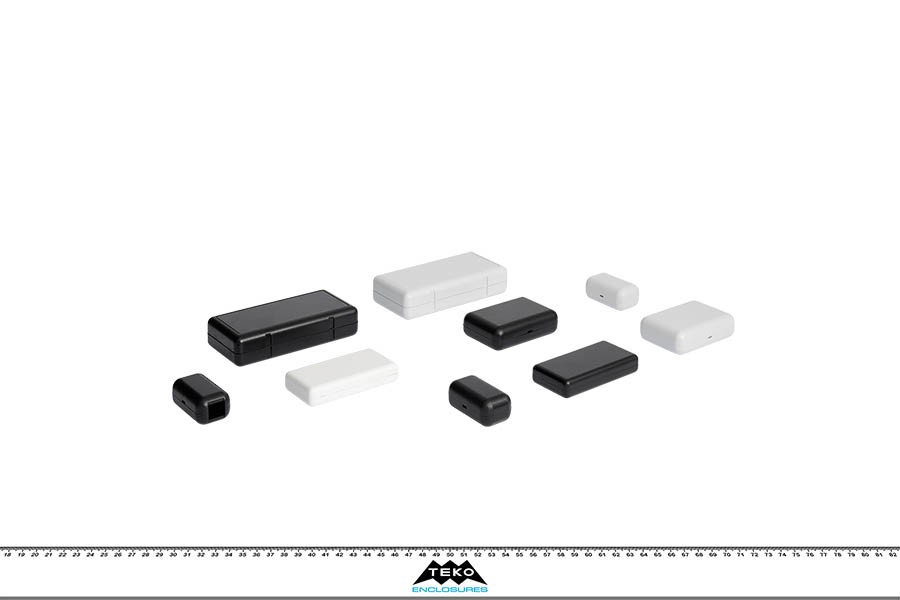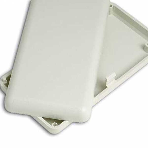 Contenitori in ABS con superfici opache ed angoli arrotondati. All’interno sono presenti dei supporti per PCB. Chiusura a scatto senza viti. I modelli “10006/1” e “10006/2” presentano rispettivamente una o due aperture (14,7 x 12,5 mm.) per connettori. Solo il modello “10014” è disponibile nei colori nero e bianco.