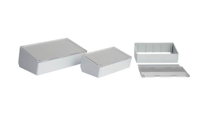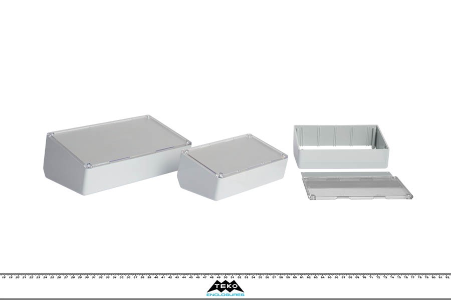 Contenitore in ABS dotato di pannello superiore in policarbonato trasparente inclinato di 15°, con pannello interno in alluminio anodizzato di spessore 1 mm. Pareti con superfici lucide all’interno delle quali sono presenti guide e punti di fissaggio per PCB. Chiusura a 4 viti.