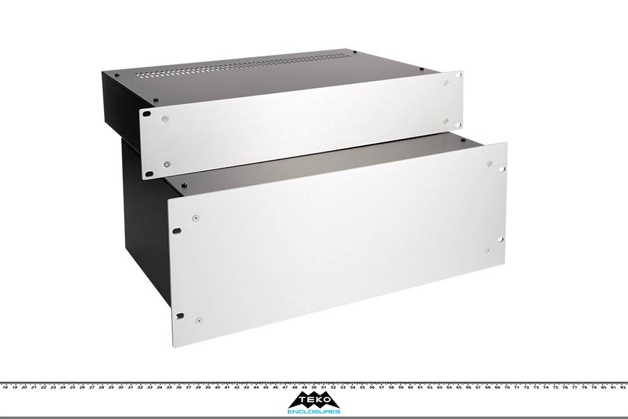 Serie di moderni contenitori da rack 19 pollici con finiture molto accurate. Pannello frontale in alluminio anodizzato di colore argento, coperchio e laterali in acciaio di colore nero. Fori superiori di aerazione. Pannelli rimovibili facilmente. ACCESSORI: Base interna zincata 175x435 mm. (Mod. LEVEL) – Maniglia piatta in alluminio anodizzato colore argento o di colore nero (Mod. FLAT RACK) – Maniglia tonda in acciaio plastificato di colore nero (Mod. ROUND RACK).