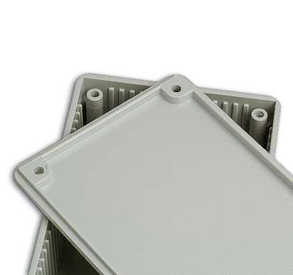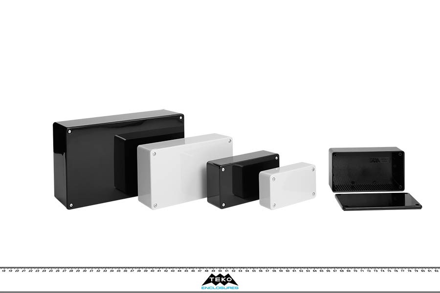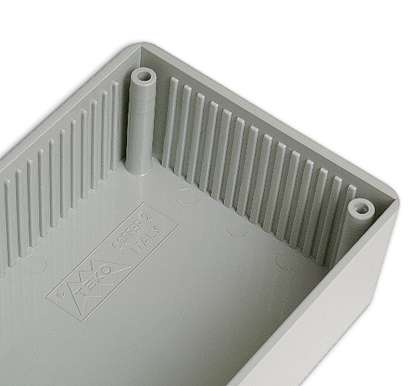 Contenitori in ABS con angoli arrotondati. Pareti con superfici lucido all’interno delle quali sono presenti guide per PCB.Chiusura con quattro viti.
