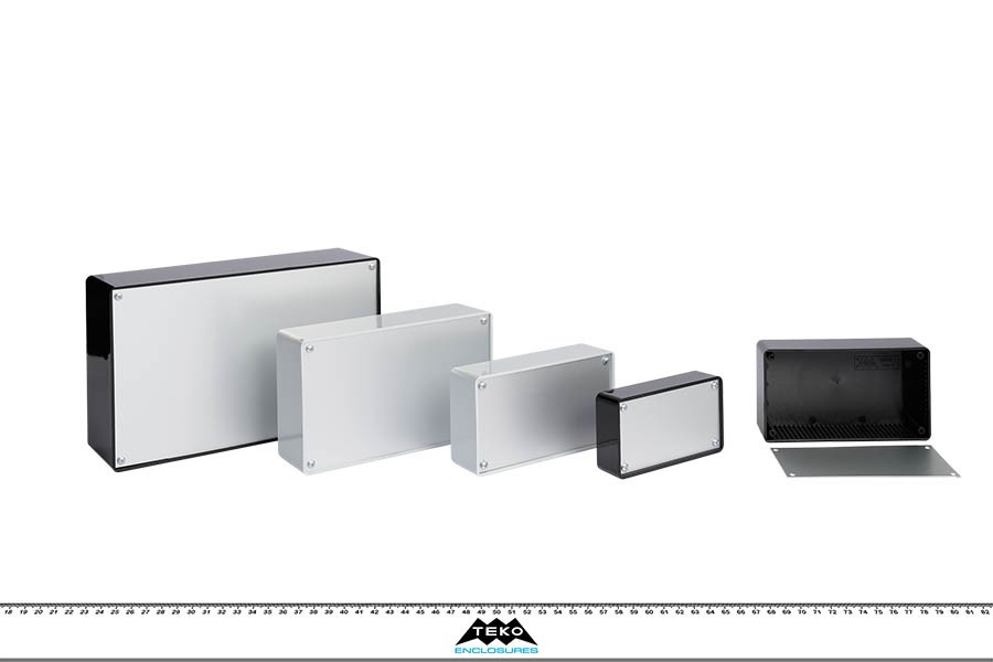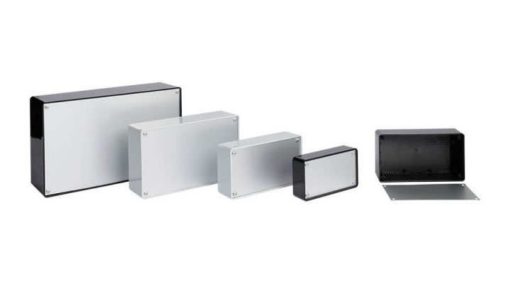 Contenitore in ABS con angoli arrotondati dotato di pannello superiore in alluminio di spessore 1 mm. e con chiusura a 4 viti. Pareti con superfici lucide all’interno delle quali sono presenti delle guide per PCB.